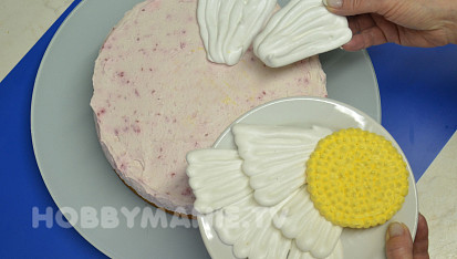 Krok 7: Ze zbylé bílé pěny pak vytvořte větší řezanou špičkou okvětní lístky a kousky upečte. Vlastně se suší při 90°C asi 2 hodiny. Jakmile jsou bezé kousky vysušené (lístky musí zůstat pěkně sněhobílé!), uložte do středu dortu žlutý střed a po obvodu jej obložte bílými lístky.