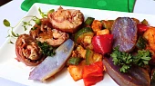 Krok 2: Vložíme je do pekáčku (nebo remosky), zakápneme olivovým olejem, mírně podlijeme a dáme péct. Když jsou skoro měkké, přidáme k nim zeleninu pokrájenou na drobné kousky, zbytek tymiánu, osolíme, opepříme a společně dopečeme.