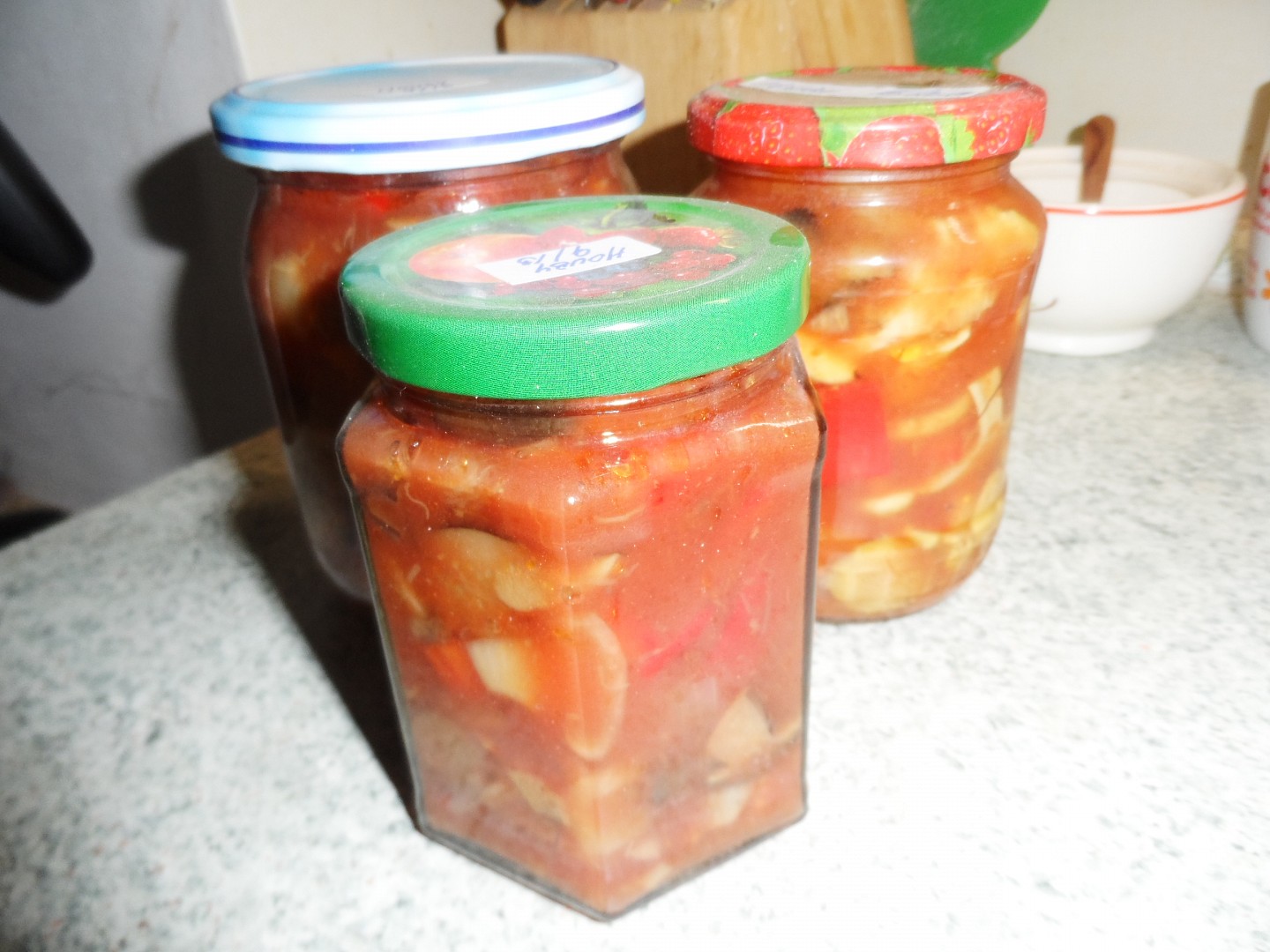 Krok 5: Vše plníme do sklenic, dobře jim otřeme hrdla, zavíčkujeme a salát sterilujeme při 100 °C 30 minut.