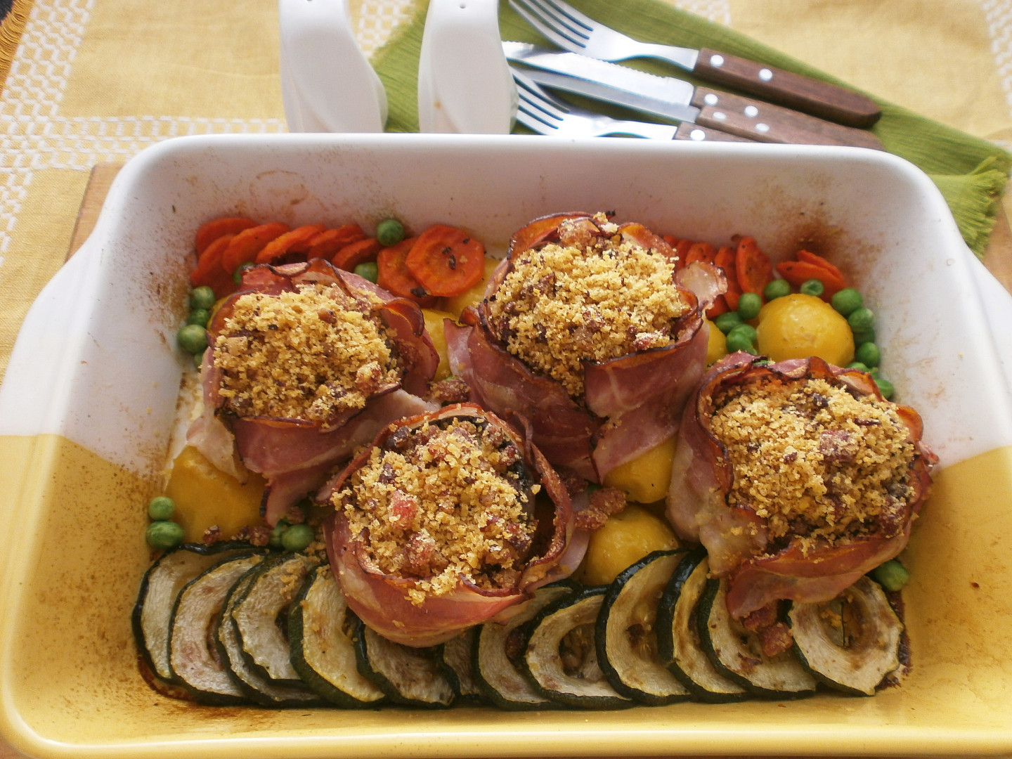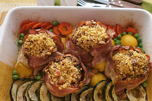 Gratinované žampiony plněné nivou s křupavou strouhankou a vůní slaniny
