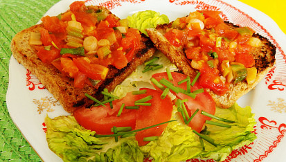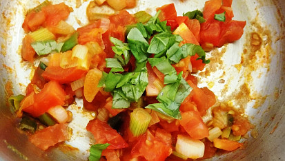 Krok 1: Opečeme chléb na topinky, česnek jen lehce rozmáčkneme, cibuli nakrájíme na jemno na kostičky a obojí osmahneme, než cibule zesklovatí nakrájíme rajčata na kostičky a před přidáním vytáhneme česnek.