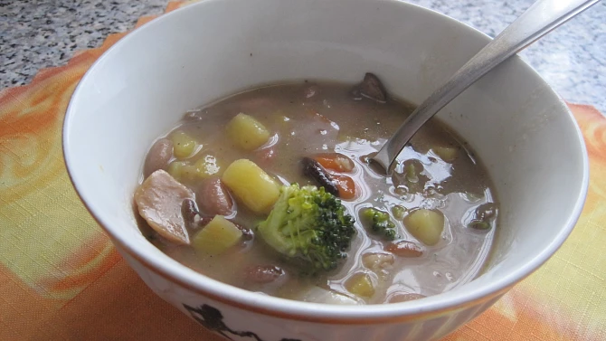 Krok 3: Do polévky přidáme houby a pozvolna vaříme. Mrkev a brambory oloupeme, pokrájíme a po 10 minutách varu přidáme do polévky. Když je zelenina téměř měkká, přidáme fazole a na drobné růžičky rozebranou brokolici.