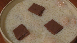 Krok 3: Poté si nachystáme jeden díl perel (například 1 hrníček) a 3 díly mléka (3 hrníčky)a dáme do hrnce. Osladíme medem nebo cukrem dle vlastní chuti a přivedeme k varu. Tapioka zprůhlední a začne houstnout.