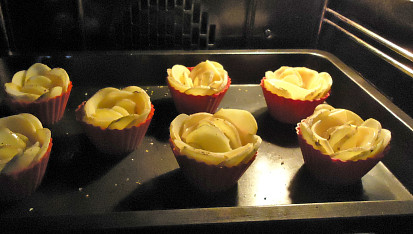 Krok 5: Z dalších bramborových plátků vytvoříme i střed kytičky, proložíme také utrženým kouskem sýra. Naplněné muffinky případně posypeme kořením (grilovací, rozmarýn podle chuti) a postříkneme olejem ve spreji.