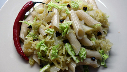 Krok 2: Těstoviny uvaříme dle návodu a vmícháme je do podušené kapusty. Můžeme přidat i několik lžic vody z vaření těstovin.