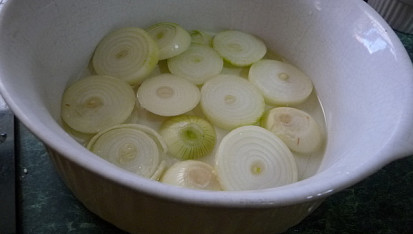 Krok 2: Na sádlo v pekáčku rozložíme plátky cibule a na ně připravené maso. Pečeme v troubě, často přeléváme vypečenou šťávou. Je-li jí málo, po trochách doléváme vývarem.
