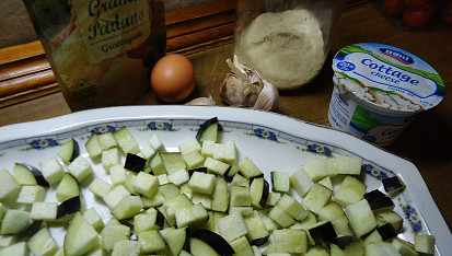 Krok 2: Mezitím smícháme v míse cottage, parmezán (či sýr podobného druhu), vajíčko. Přidáme z pánve zchladlý lilek, petržel, promícháme, podle chuti osolíme a trochu zahustíme polentou, aby vznikla tužší směs.