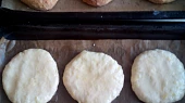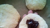 Krok 4: Těsto rozdělíme na poloviny. Z každé poloviny lžičkou uděláme 6 hromádek, které odkládáme na moukou posypaný vál.(Celkem tedy 12 stejných dílků.) Jednotlivé hromádky rukama zpracujeme do placky a doprostřed dáme povidlovou náplň (stačí jen i povidla samotná a rozhodně jimi nešetříme) a okraje zmáčkneme k sobě, aby vznikl pěkný plněný bochánek, který položíme na plech spojem dolů. Až máme plech plný (6 bochánků), tak je jemně rukou rozmáčkneme. Potřeme olejem nebo rozpuštěným máslem a dáme na cca 25 minut péct. Mezitím připravíme i druhý plech, ovšem s rozmačkáváním na placku a maštěním počkáme, než je budeme dávat péct.