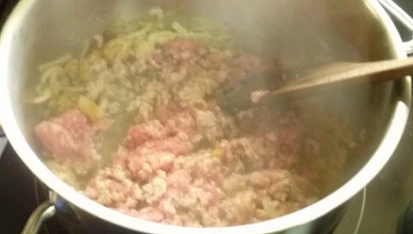 Krok 2: Na oleji osmahneme oloupanou a nakrájenou cibuli, na ní zpěníme obě mleté papriky. Pak vmícháme a lehce osmahneme protlak a na tomto základu mleté maso. Smažíme za stálého míchání, aby se maso nespeklo do hrudek.
