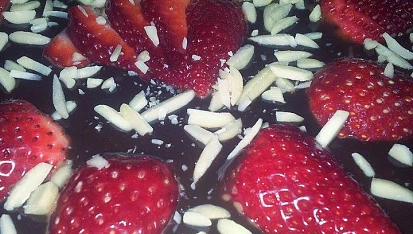 Krok 4: Z lednice vyndáme dortovou formu s korpusem a nalijeme na něj vzniklý čokoládový krém. Poklademe jahodami (celými nebo nakrájenými) a zasypeme oříšky.