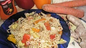 Krok 3: Nakoniec vmiešame uvarené čínske rezance (nudle). Niekedy pridávam aj mrazenú zeleninovu zmes "Čína".
