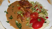 Vepřové nudličky v pikantní omáčce s houbami a sýrem