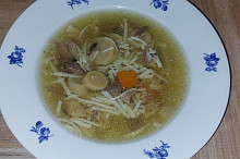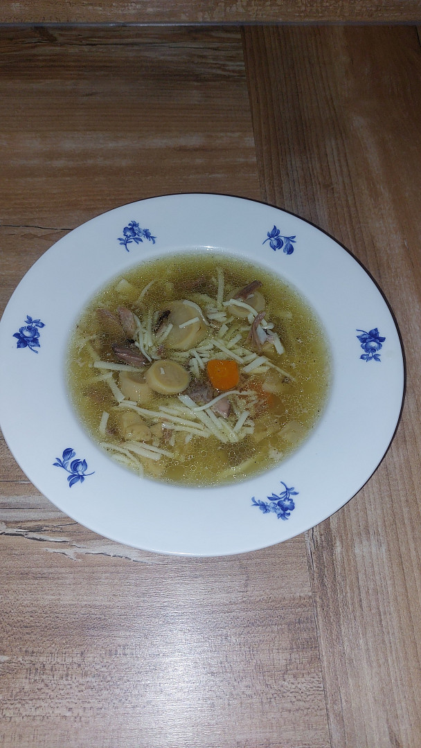 Vývar z kančích opečených kostí, s masovými knedlíčky z papiňáku