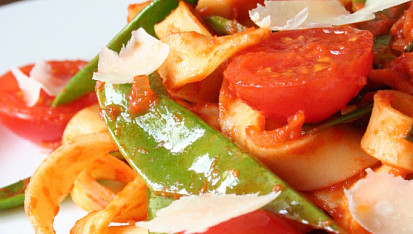 Domácí tagliatelle s cukrovým hráškem a rajčaty