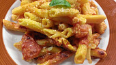 penne s kuřecím masem a protlakem,