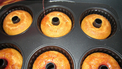 Krok 9: Jakmile vyndáte bábovky z trouby, ještě ve formičkách je lehce na několika místech propíchejte špejlí a přelijte asi polovinou sirupu.
