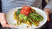 Míchané tofu s opečeným tempehem a grilovaným chřestem