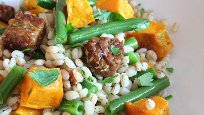 I čistě vegetariánský recept může být velmi chutný, doslova vymazlený do poslední špetky vsypaného koření. Křupavé blanšírované fazolky, syté kroupy, nasládlá pečená dýně a bílkovinu nesoucí tempeh vytváří společně vyvážený a hodnotný pokrm.