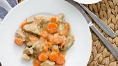 Krok 2: Orestované maso zaprášíme moukou, krátce ji zarestujeme, zalijene větší částí vývaru, osolíme, opepříme, přidáme špetku muškátového oříšku (používáme-li) a pod pokličkou dusíme 35 minut.