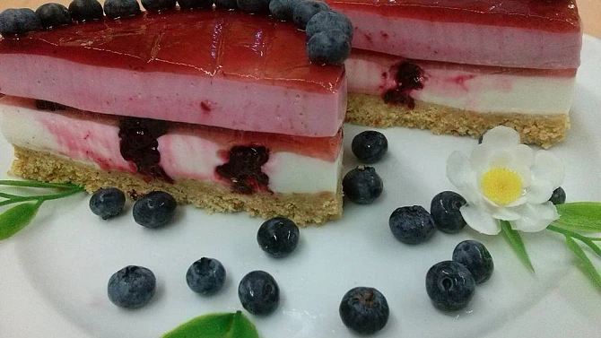 Žádné pečení, žádné složité postupy. Základ tvoří sušenkový korpus s máslem, na něj přijde jemná jogurtovo-tvarohová náplň a ovocná želatinová vrstva. Výsledek vypadá slavnostně, ale zvládne ho i úplný začátečník.