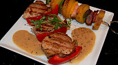 Vepřová panenka s bramborovým špízem a houbovým přelivem