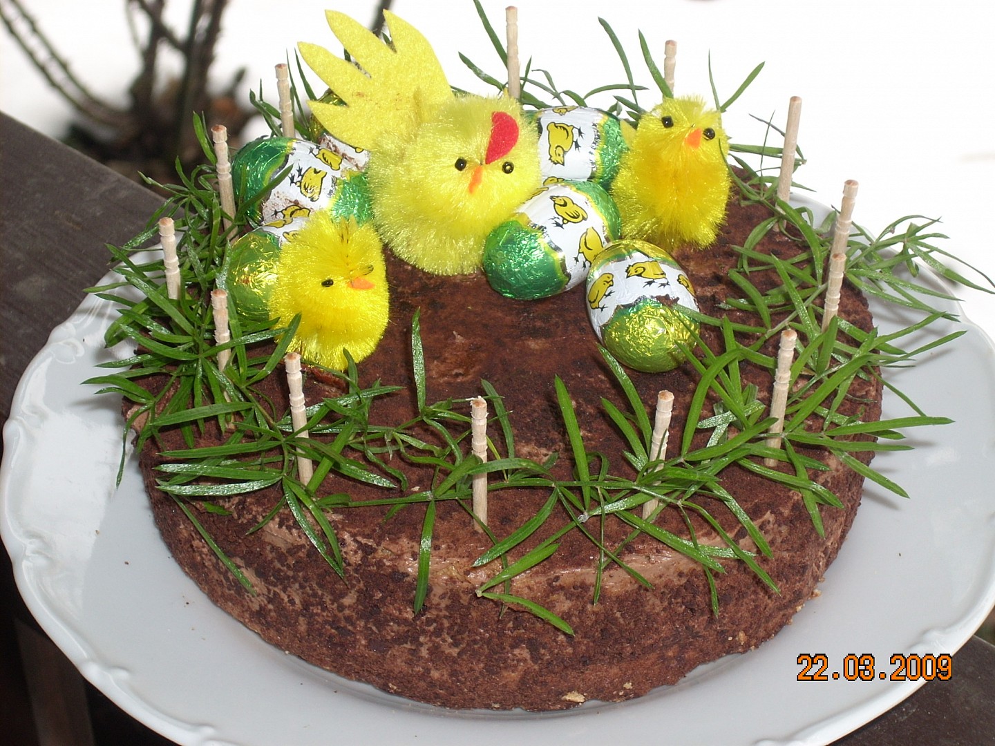 Inspirace na velikonoční dortík v podobě zahrádky s kuřátky. Párátky znázorněte plot, přidejte zelené větvičky či mašli, kuřátka z marcipánu nebo oblíbené velikonoční postavičky a čokoládová vajíčka. Uvidíte, že zejména děti budou nadšené.