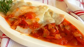 Krok 3: Na každý štvorec dáme náplň. Prehneme do trojuholníka a pirohy zlepíme. Pirohy varíme v osolenej vode pomalým varom asi 8 min. Záleží to od hrúbky cesta.