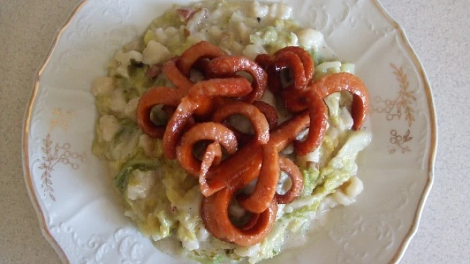 Dušená kapusta na smetaně s nočky a chobotničkami z párků