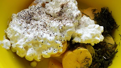 Krok 2: Smícháme cottage, jogurt, sůl, pepř a kopr a přimícháme k bramborám. Nakonec zlehka vmícháme vajíčka.