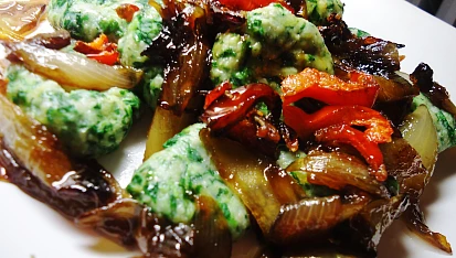 Špenáto-ricottové noky z ovesné mouky s karamelizovanou cibulí