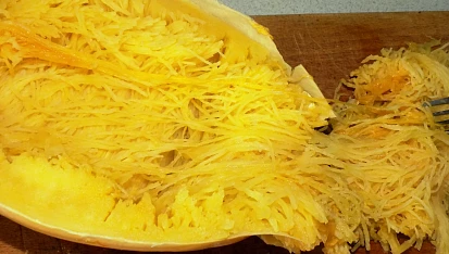 Špagetová dýně má úžasnou vlastnost, po jejím upečením dužina změní strukturu a vidličkou se z ní dají vytvořit špagety, které se hodí jako lahodná příloha místo klasických těstovin. Spolu s rajčatovou omáčkou a masovými kuličkami chutnají božsky.