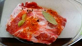 Krok 1: Žebra jsem osolil, přidal jsem nakrájený česnek, cibuli, posypal Harissou, celý pepř, bobkový list, jalovec, nové koření, 0,5 litru bílého vína.