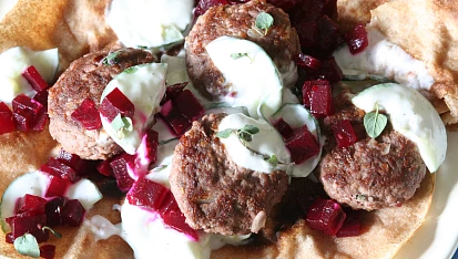 Jehněčí kofty s celozrnnou plackou, jogurtovým dipem a červenou řepou