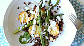 Pečené brambory s chřestem, čočkou a sezamovým dresingem