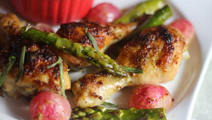 Kuřecí paličky pečené s chřestem a ředkvičkami s hořčičnou zálivkou
