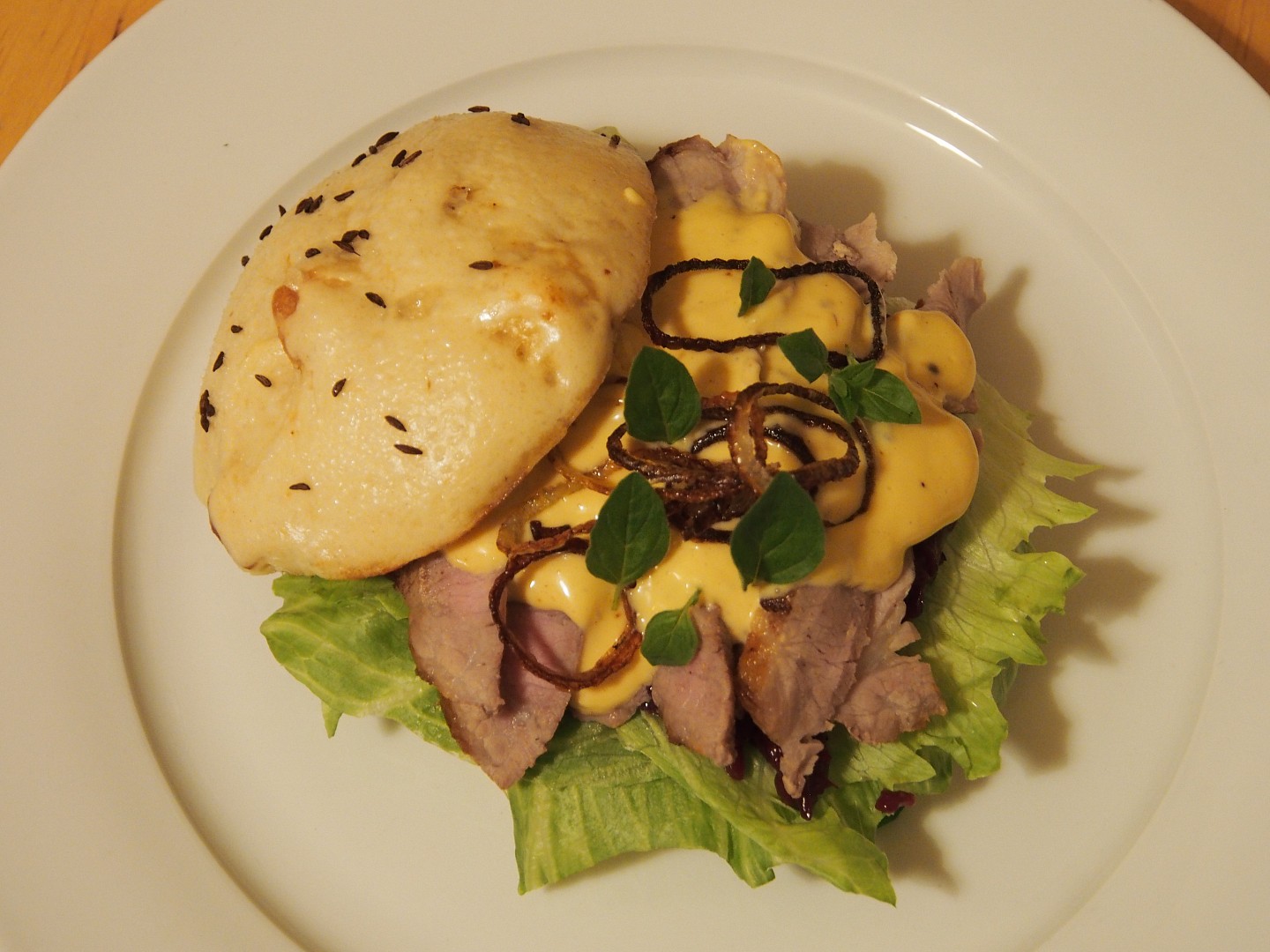 Housku rozkrojenou na půl orestujeme na másle. Na spodní část housky nandáme ledový salát, zelí, maso, majonézový dresink, kroužky cibule . Lze přidat i plátky jablka.