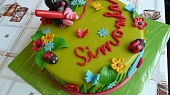 Krok 5: Mezi 2 mikroteny si hmotu rozválíme na sílu asi 4 mm a potáhneme celý dort, uhladíme. Ze zbytku marcipánu barvíme a tvoříme ozdoby na dotvoření dortu. Na dort je přilepujeme pouze tak, že si místo potřeme trochu vodou, ale ne moc.