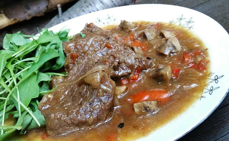 Krok 2: V hrnci rozehřejte olej a cibuli na něm opékejte. Dávejte pozor, aby se cibule nepřipálila. Čím déle jí budete restovat, tím lépe se rozvaří a dodá omáčce hustotu a barvu, takže je dobré, si dát na čas. Přidejte maso a opečte ho z obou stran, aby se zatáhlo. Přidejte kapii, žampiony a podlijte maso, aby bylo celé ponořené.