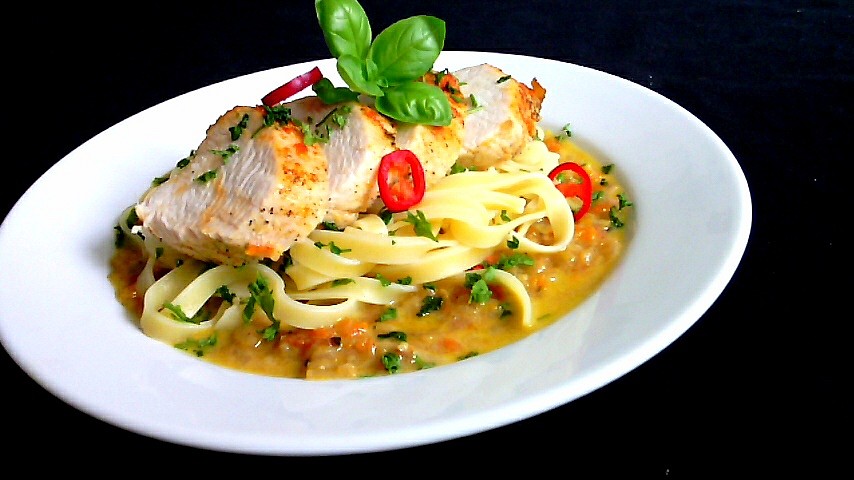 Tagliatelle na smetanovo - zeleninovém základu s grilovaným kuřecím prsem