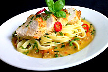 Tagliatelle na smetanovo - zeleninovém základu s grilovaným kuřecím prsem