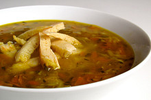 Zeleninová polévka s celestýnskými nudlemi a pestem z medvědího česneku