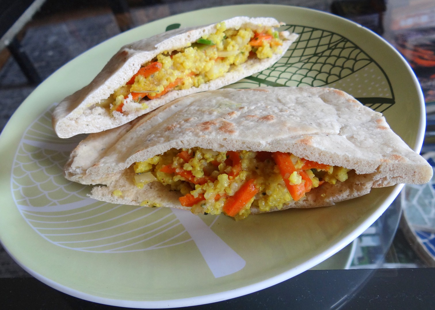 Krok 4: Pokud chceme hned podávat - rozkrojíme placku napůl a naplníme ji předem připravenou směsí. (Na obrázku je náplň z jáhel s kari kořením a dušenou zeleninou.) Ale může být cokoliv jiného (masová směs, gyros, tzaziky, čerstvá zelenina, apod.)