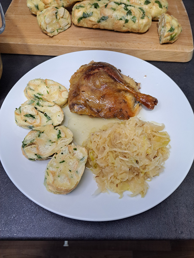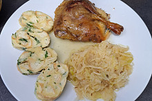 Konfitovaná kachna se sladkým zelím a bramborovými knedlíky