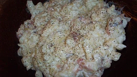 Krok 3: Uvarené halušky necháme odkvapkať, polejeme vyškvarenou slaninou, smotanou a posypeme zvyškom sekaného kôpru.