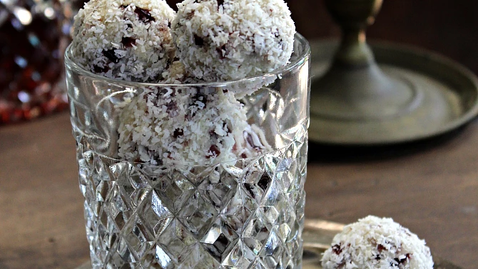 Tyto bezlepkové kuličky opravdu neobsahují piškoty ani hladkou mouku. Jsou tvořeny z nasekaných sušených brusinek, kokosu, mandlové mouky a pár dalších ingrediencí. Jsou hotové za chviličku a navíc výborně chutnají.