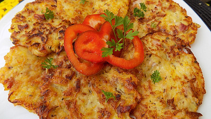 Krok 2: Přidáme vejce, koření a zbytek surovin. Mléko s moukou dáváme postupně, až se vytvoří polohusté těstíčko. Smažíme tenké placičky z obou stran do křupava. Hotové dáme na ubrousek odsát přebytečný tuk.