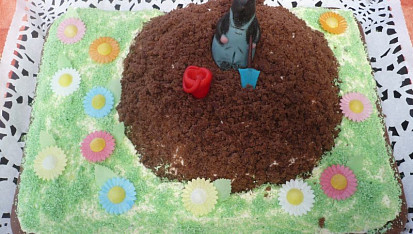Krok 4: Část krému použijeme na ozdobení louky, povrch korpusu lehce potřeme krémem a posypeme obarveným kokosem. Do ostatního krému lehce vmícháme čokoládovou drť nebo rýži. Připravenou směs navršíme na banány ve tvaru krtince a povrch posypeme drtí z upečeného korpusu. Drť lehce přitlačíme, aby se na krém nalepila.