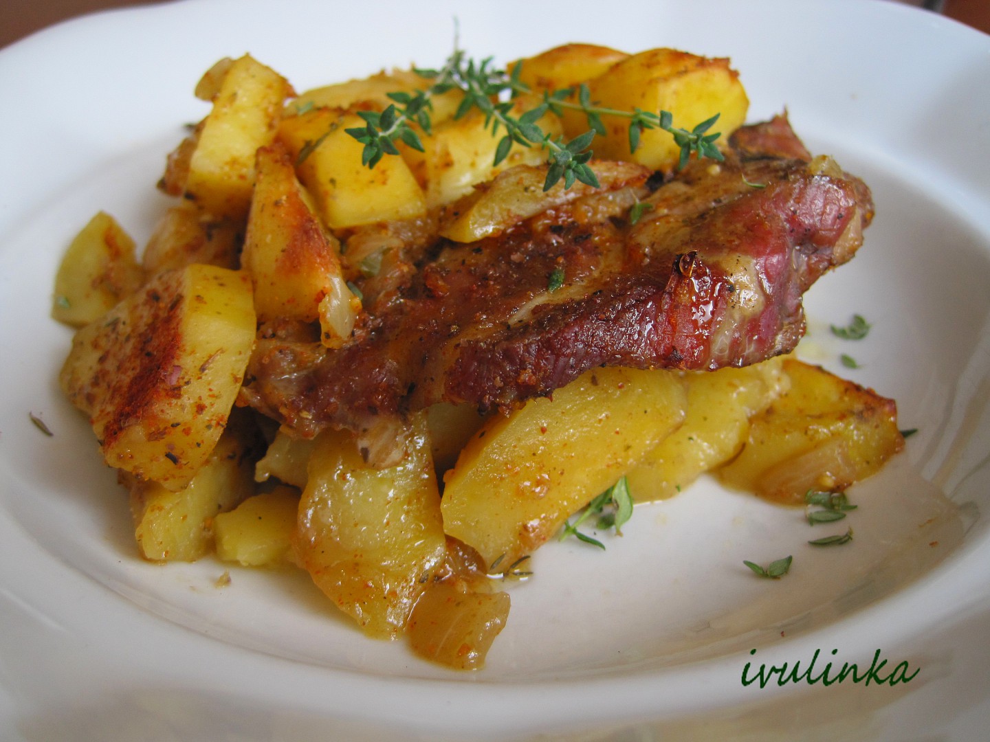 Bylinkové brambory s krkovičkou z jednoho pekáčku