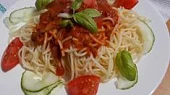 Špagety s omáčkou z rajčat, mletého masa a okurek