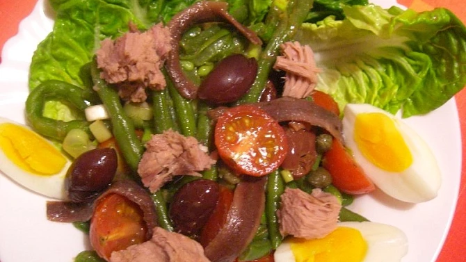 Salát Niçoise pochází z francouzského města Nice. Salát se původně skládal pouze z čerstvé zeleniny, ančoviček a natvrdo uvařených vajec. Nyní je salát celosvětově velmi oblíbený a připravovaný v mnoha variacích, jako je například tato, s vařenými fazolkami.